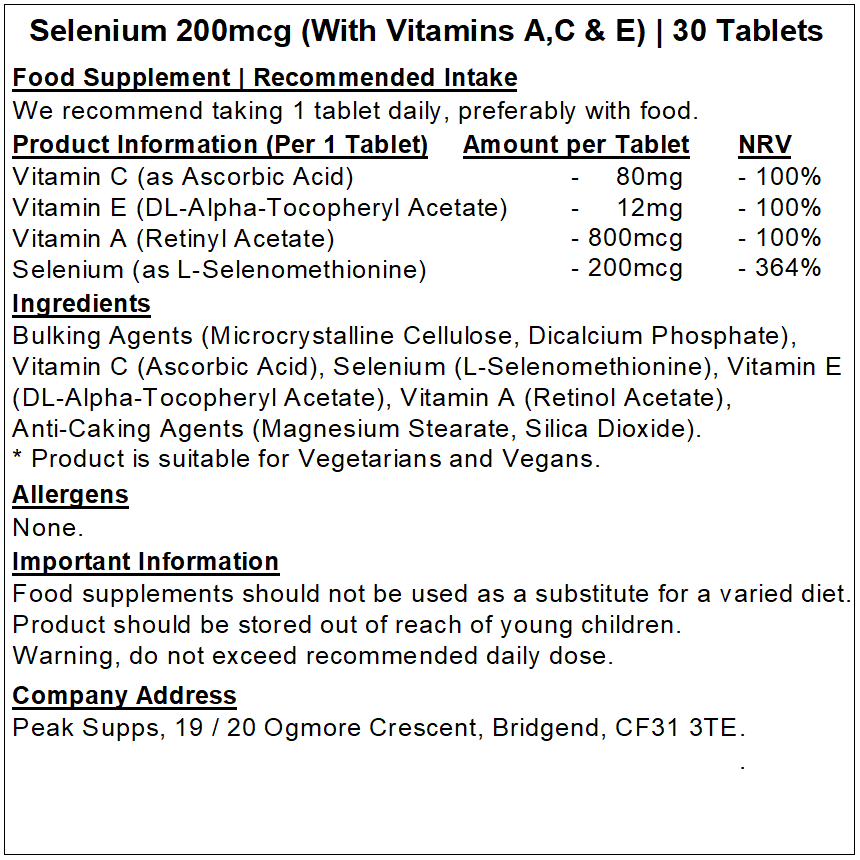 Peak Supps Selenium tablets also contain Vitamins A, C & E which also provide several benefits. Vitamin A contributes to the maintenance of normal vision. Vitamin C contributes to a reduction of tiredness and fatigue. Vitamin E contributes to the protection of cells from oxidative stress.