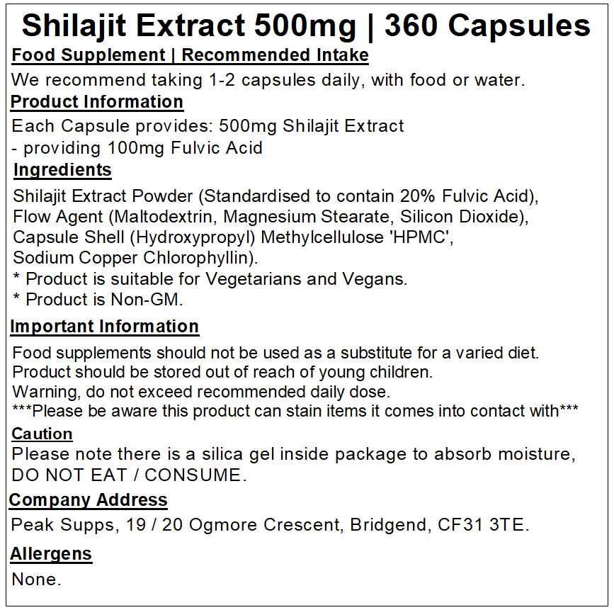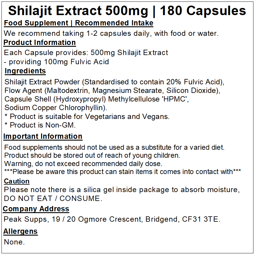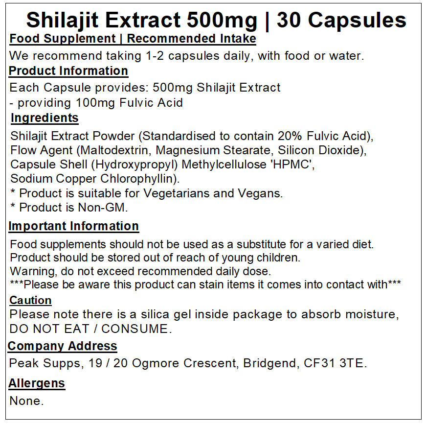 Shilajit Extract Powder (Standardised to contain 20% Fulvic Acid), Flow Agent (Maltodextrin, Magnesium Stearate, Silicon Dioxide), Capsule Shell (Hydroxypropyl Methylcellulose 'HPMC', Sodium Copper Chlorophyllin).