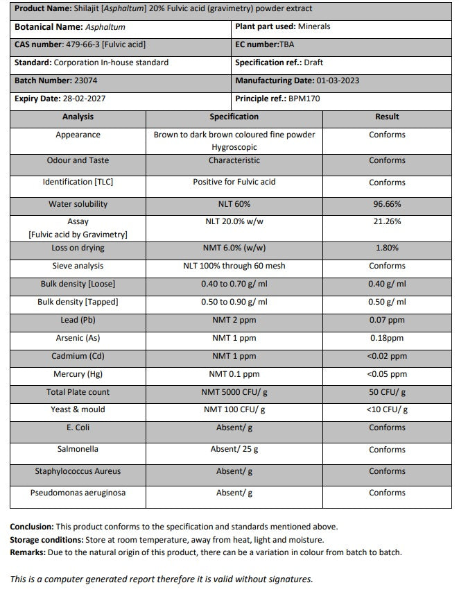 Shilajit is considered an herb and is used in ayurvedic remedies. Peak Supps Shilajit Extract is sourced in India and contains 100mg (20%) fulvic acid. Fulvic acids are organic acids that are found in humus, an organic component of soil. Due to their complicated structure, fulvic acids are difficult to produce synthetically, making the organic version the easiest to source.