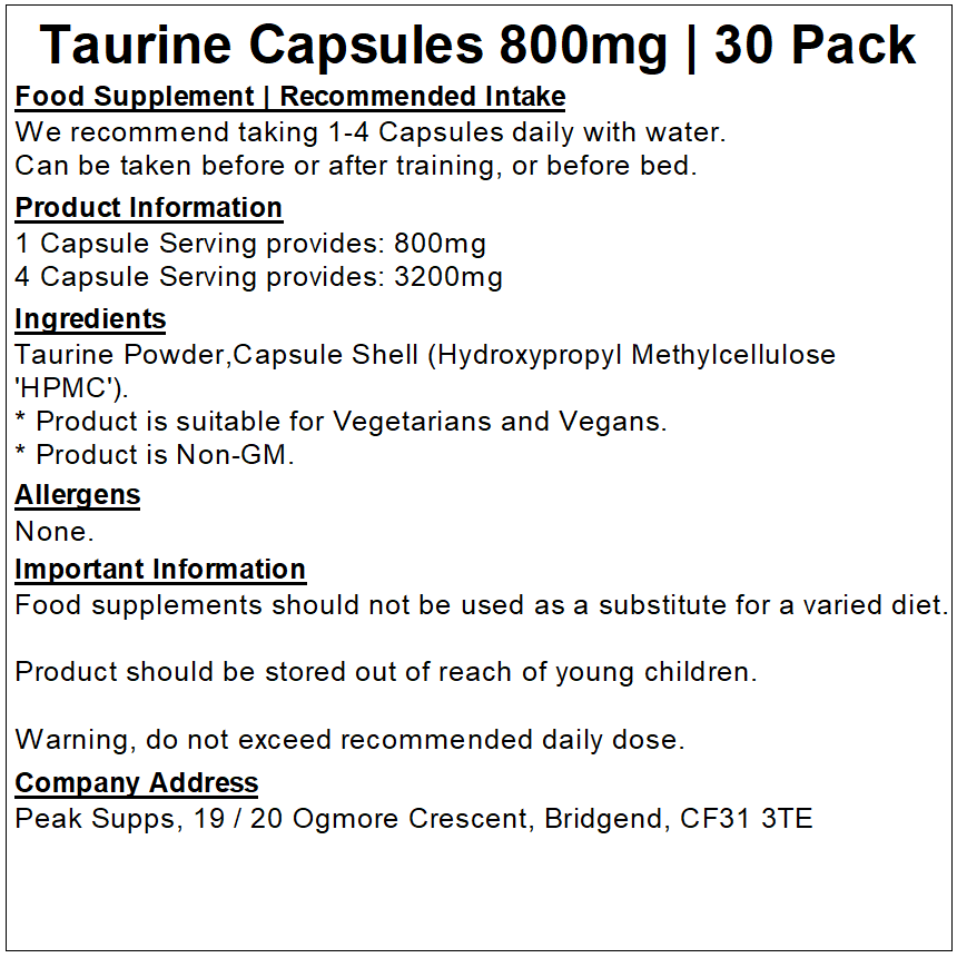 Peak Supps Taurine Capsules provide 800mg of Taurine. Taurine is a popular pre-bed supplement due to its role as a neurotransmitter. It is also a common key ingredient in energy drinks and can be taken pre/post-workout.