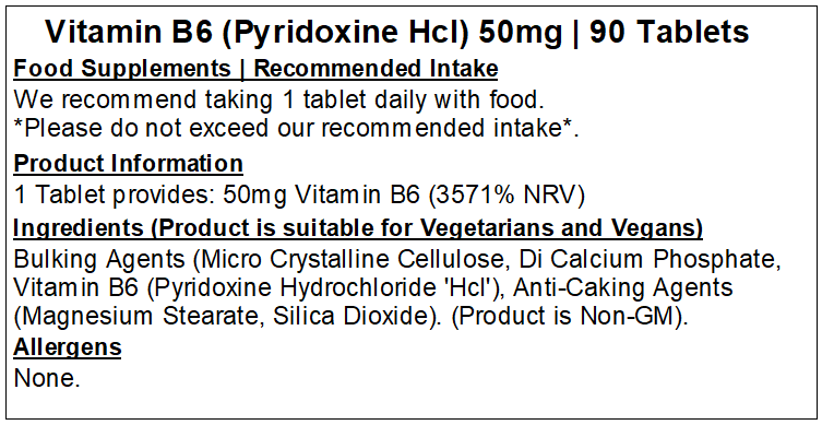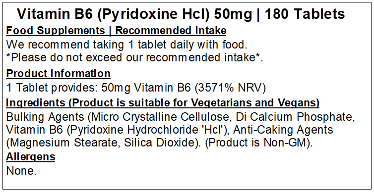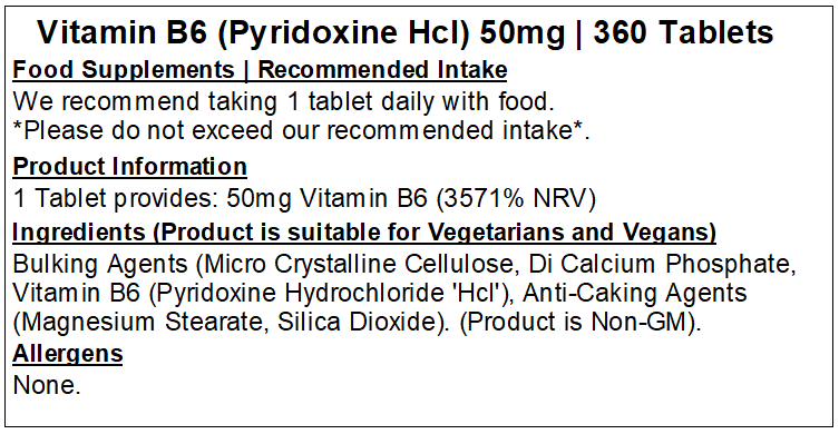 Peak Supps Vitamin B6 Tablets provide 50mg of Vitamin B6 (3571% NRV).