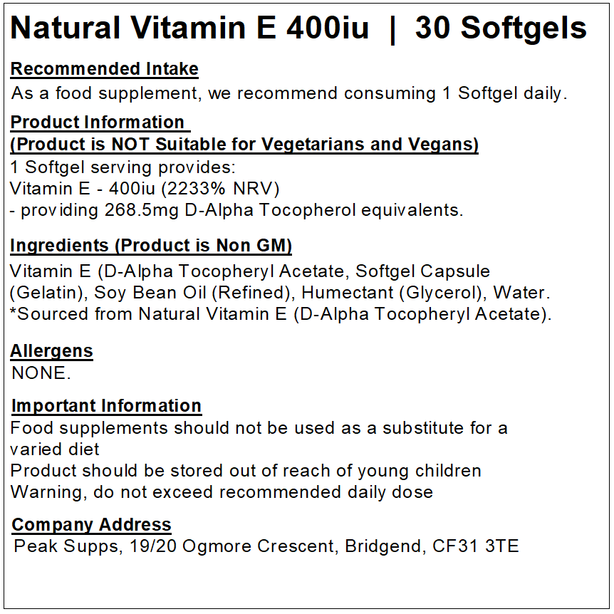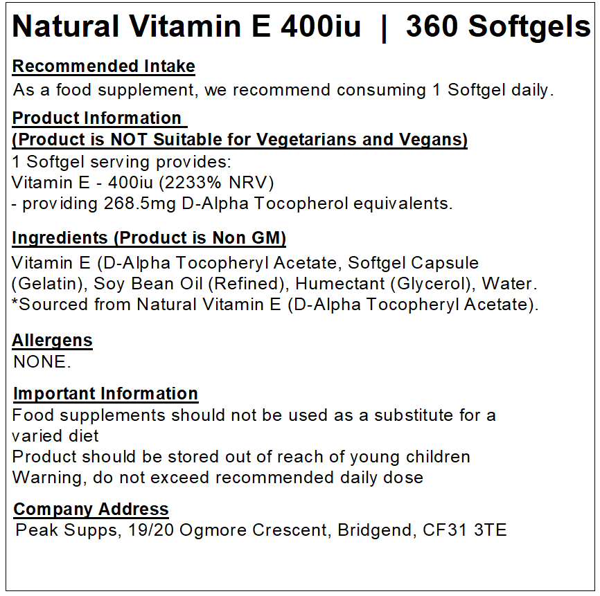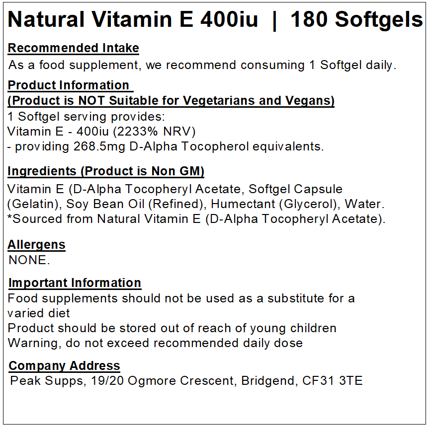 Peak Supps Vitamin E 400iu Softgels provide four times the quantity of Natural Vitamin E in comparison to our Vitamin E 100iu Softgels. As a result, fewer Softgels are required to achieve the recommended daily intake.