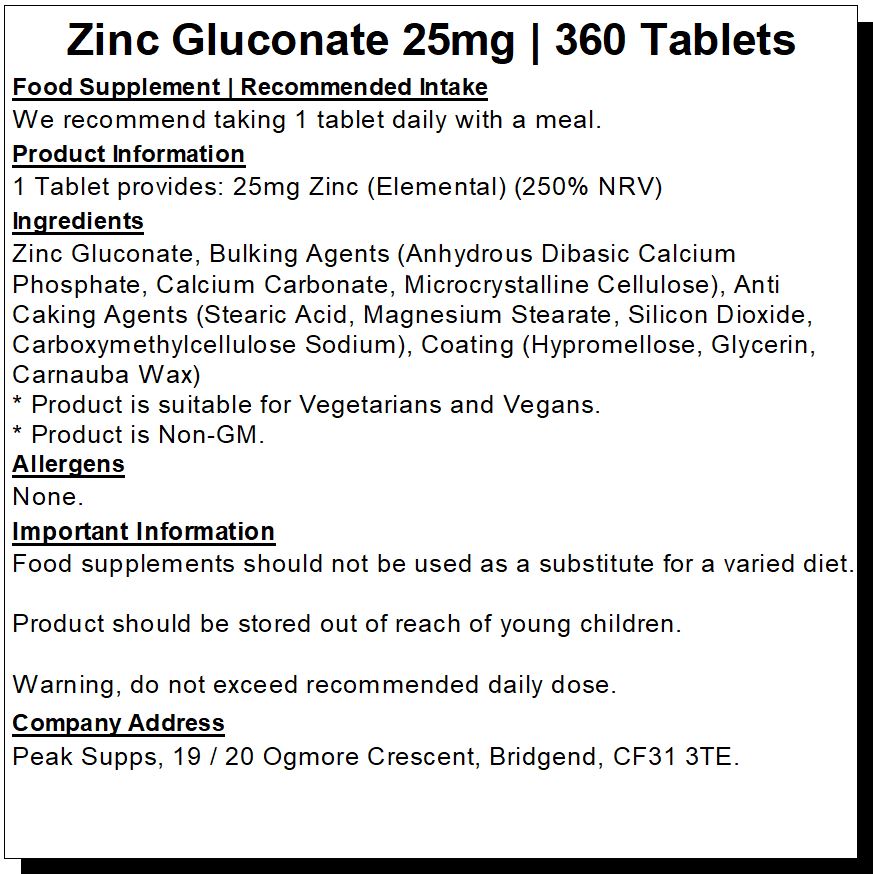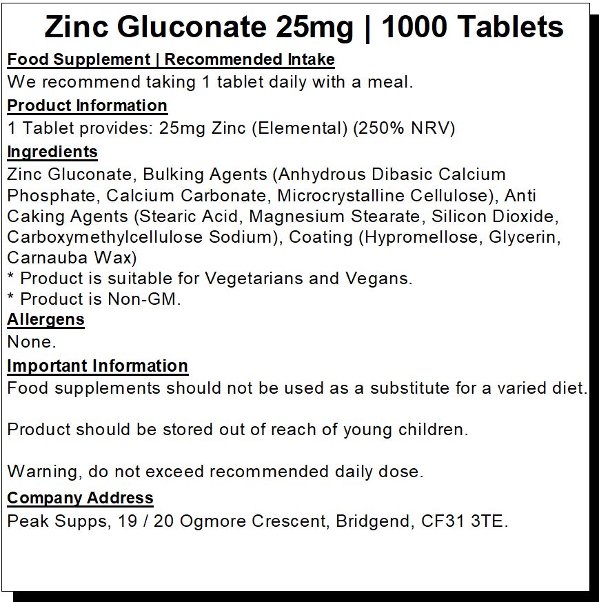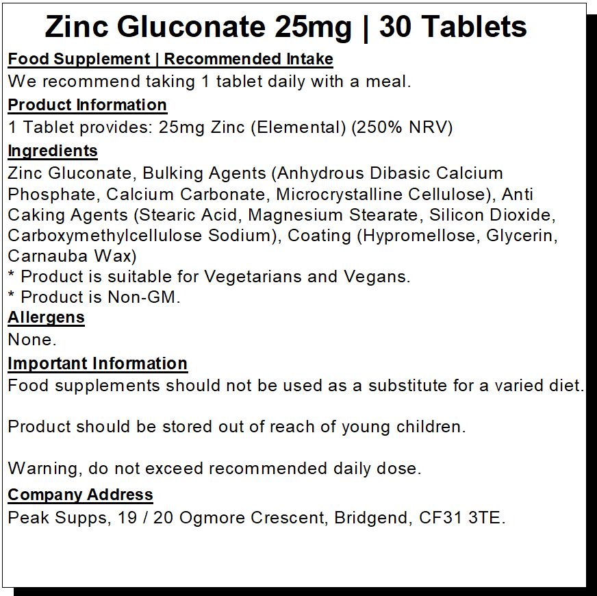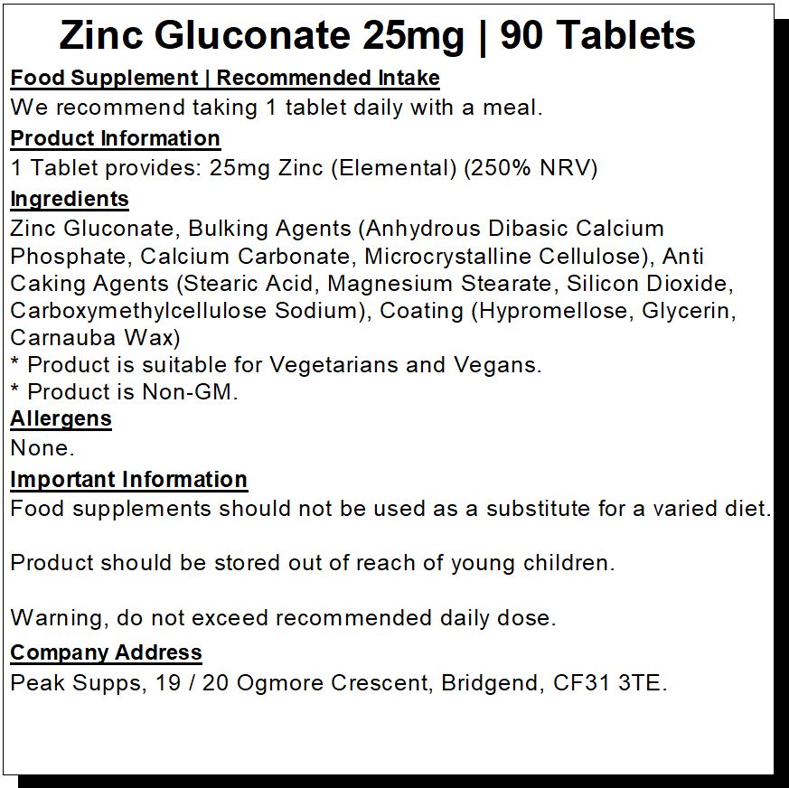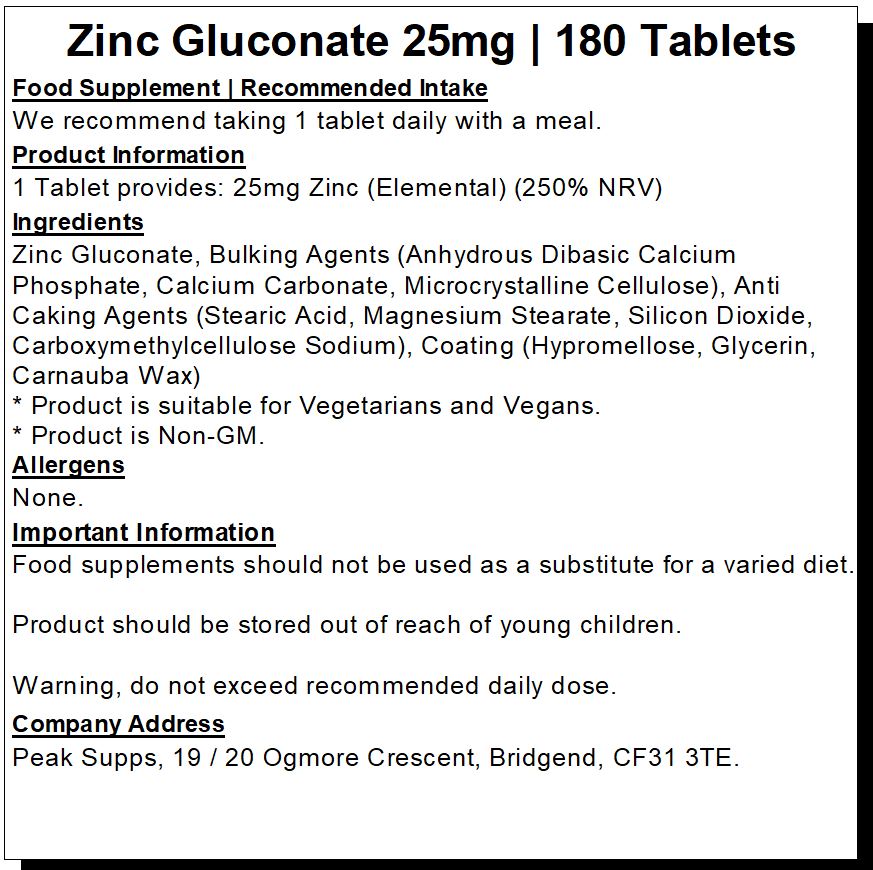 Peak Supps Zinc Gluconate provides 25mg (200% NRV) of Elemental Zinc in each tablet. Zinc contributes to normal cognitive function, normal metabolism of fatty acids and the maintenance of normal bones.